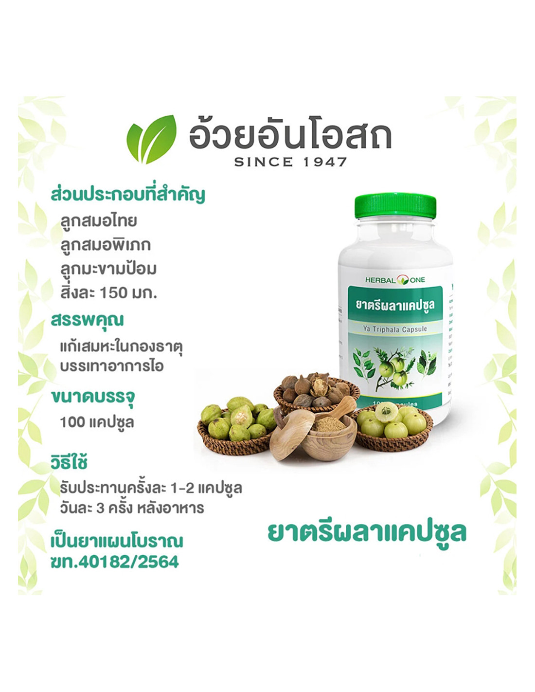 Herbal One Ya Triphala is a natural blend of three fruits — Terminalia chebula, Terminalia bellirica, and Phyllanthus emblica. Traditionally used in Thai and Ayurvedic wellness to support digestion, detox, and body balance. A natural antioxidant source that promotes overall well-being and vitality.