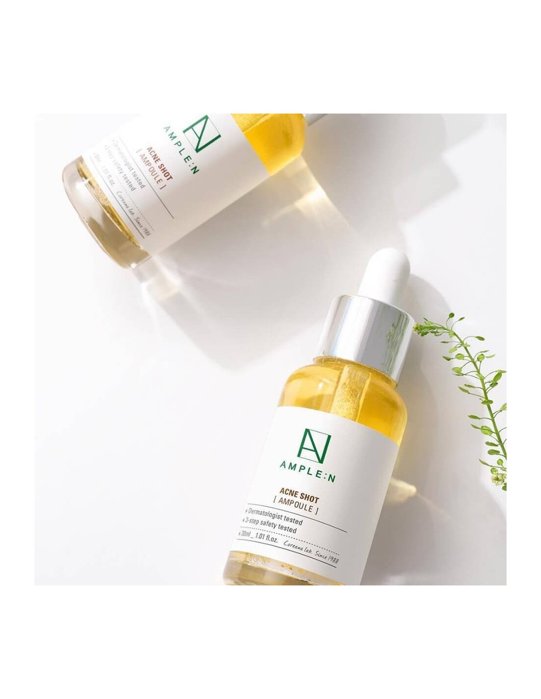 AMPLE:N Coreana Acne Shot Ampoule 30ml — a lightweight serum designed to balance and calm oily, blemish-prone skin. Infused with 45% Propolis Extract, it helps soothe visible redness and support clearer-looking skin. The formula combines botanical extracts and skin-revitalizing ingredients that promote smoother texture and a healthy-looking complexion.